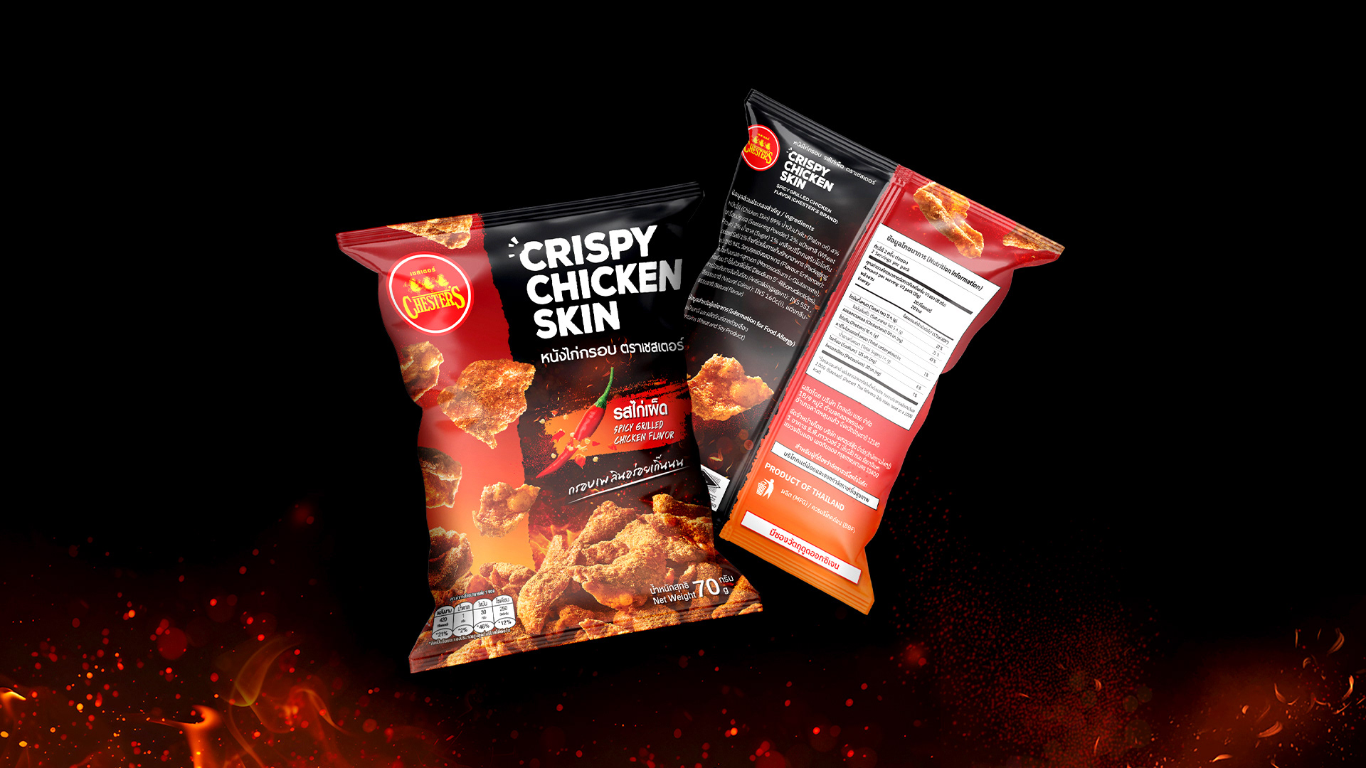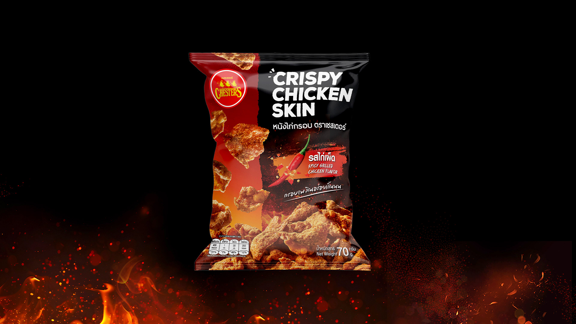 Packaging design for the new snack launch, Crispy Chicken Skin – Spicy Grilled Chicken flavour.