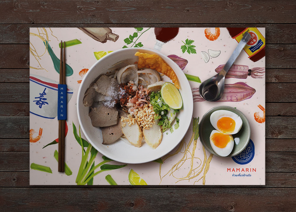 dentity design for MAMARIN, a Thai noodle restaurant in central Bangkok. MAMARIN’s signature dishes are their Ban Bueng Noodles which are famous local recipes of Chon Buri, the Thai coastline province with many well-known beaches and islands such as Pattaya beach and Koh Lan. As the owner’s hometown is Chon Buri where MAMARIN's secret recipes were created by his mother as well as the highlight ingredient of Ban Bueng noodles being seafood, the name was from a combination of 2 words MAMA+MARINE = MAMARIN. Identity colour, orange and marine blue, represents MAMARIN's tasty & authentic recipes and a sense of the sea. The logo symbol is a top view of the signature Ban Bueng noodles.