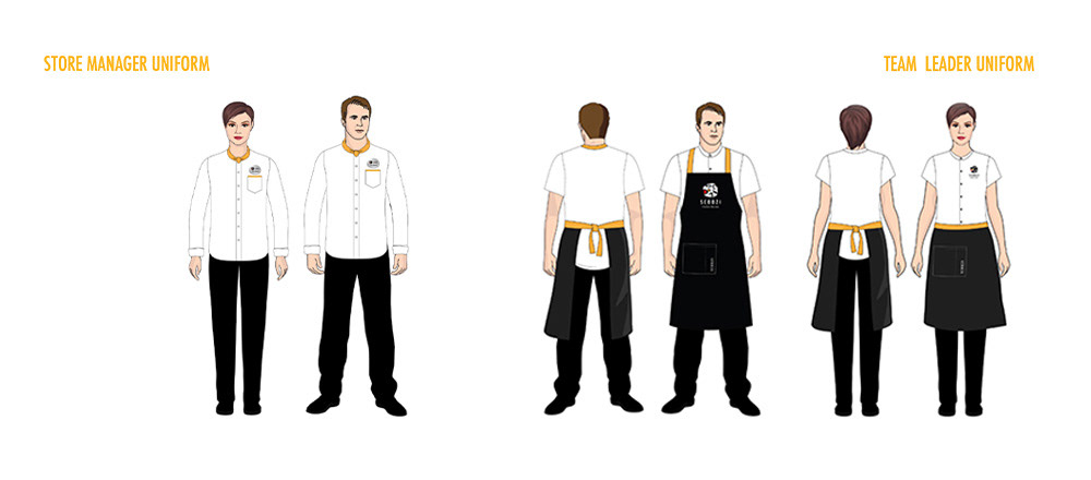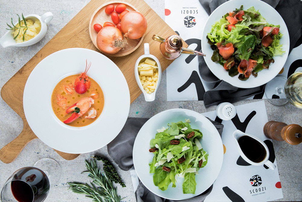 Identity design for Scoozi, Italian pizza & pasta restaurant serving lovable authentic taste from 16 branches throughout Bangkok. The design utilised five elements to communicate the concept of “Craftopia” starting from the round logo background which is a blend of epsilon and pizza shapes. The name SCOOZI was merged with the simplified shape of people to represent a sense of joy, creativity, craft and variety. To clearly signify a character of pizza brand, red and yellow from tomato sauce and cheese were chosen as primary logo colours as well as being an appetite-stimulating colours associated with energy and happiness.